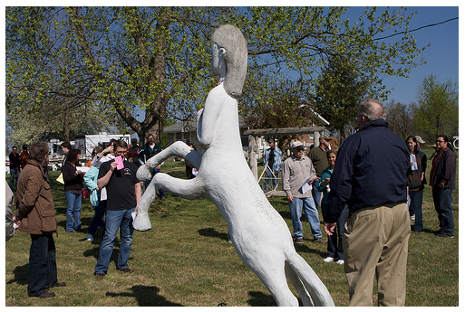 John bids on a 7-foot tall concrete Centaur for eventual reinstallation at Missouri State University in Springfield, MO.