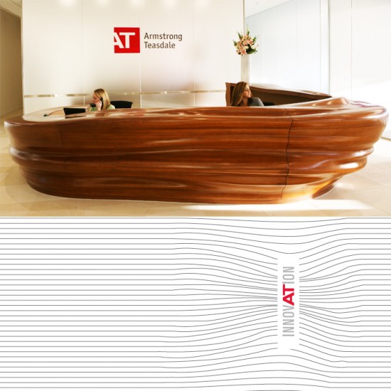 AT brought us in to rebrand as they were moving from their walnut-panelling and crystal downtown offices to spectacular new offices in Clayton’s Centene Tower. It was time for a new brand identity to launch with the new space. And what new spaces they are! Designed by Studios Architecture, the space is both thrillingly contemporary and filled with a sense of veiled power. Throughout, clean glass lines are interrupted by immense shape-shifting wood forms whose curves undulate and enclose, as if the fabric of space has been disrupted by some unseen gravity well.