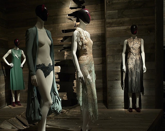 One of my favorite rooms was entitled “Highland Rape,” (2) which had nothing to do with what one might first call to mind—but the generational “genocide” of the land and culture by the British Empire. The royal and highly decorated blood-red dresses were set against a backdrop of violent, broken wood, actual holes in the walls that looked as if they were made by cannon shot or axe.