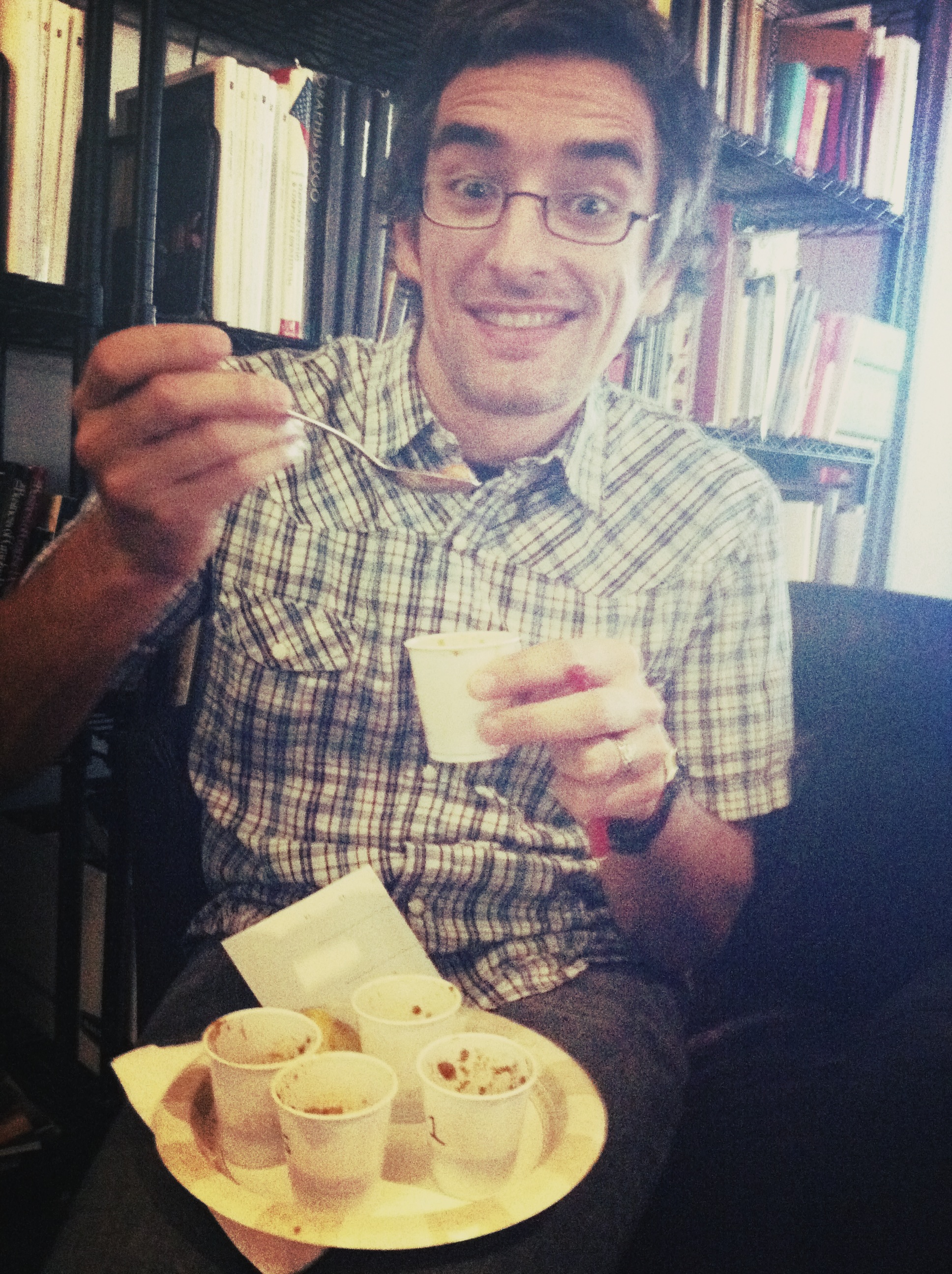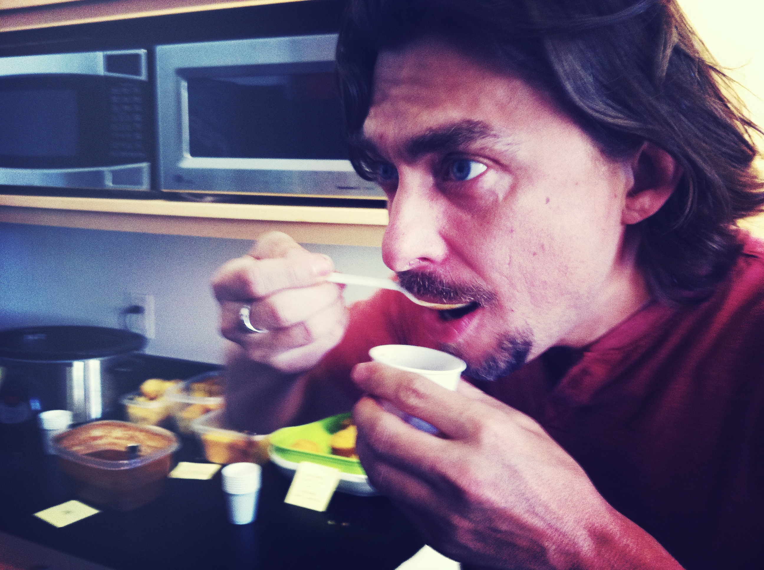 Jamie pretending to enjoy everyone else’s chili except his own. I mean his wife’s chili, because apparently your wife can make your chili for you in a company chili cook-off.