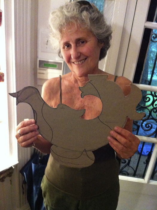 Eva’s daughter Jean Richards shows us a cardboard template for one of her mother’s designs. Photo by John Foster.