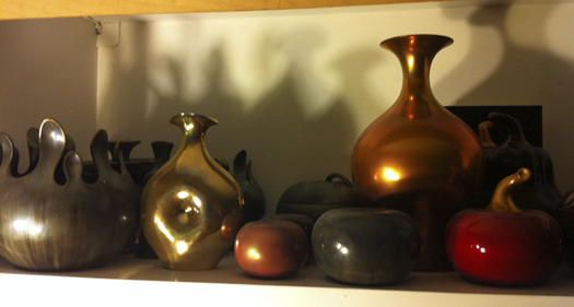 It wasn’t a surprise to see the curved, organic form everywhere in her studio. Tacked and taped to the walls were preliminary sketches of ceramic pieces and even working cardboard maquettes of her famous coffee table, the graceful glass-topped object with hints of Baroque styling and Noguchi classicism. With this special opportunity to view a lifetime collection of work in one place, it became clear to me that Ms. Zeisel rarely made forms designed to stand alone. Eva has been quoted over the years as saying that her work was inspired by the human form, including families and especially the mother and child. As our memorable visit drew to a close, we said our goodbyes to an extraordinary mother, artist, and national treasure.