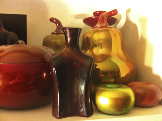 At the time of our visit, Ms. Zeisel needed assistance to walk, so she remained seated when we rose to take the tour. The studio was located just off the main room in an upper level and was full with sketches, working maquettes, and scale drawings in charcoal of current designs and dreams yet to be realized. Most importantly, there were groupings of almost every major (and minor) work in the artist’s lifetime, from ceramic pieces created when she was a teenager to early paintings and designs that became the nexus of later work.