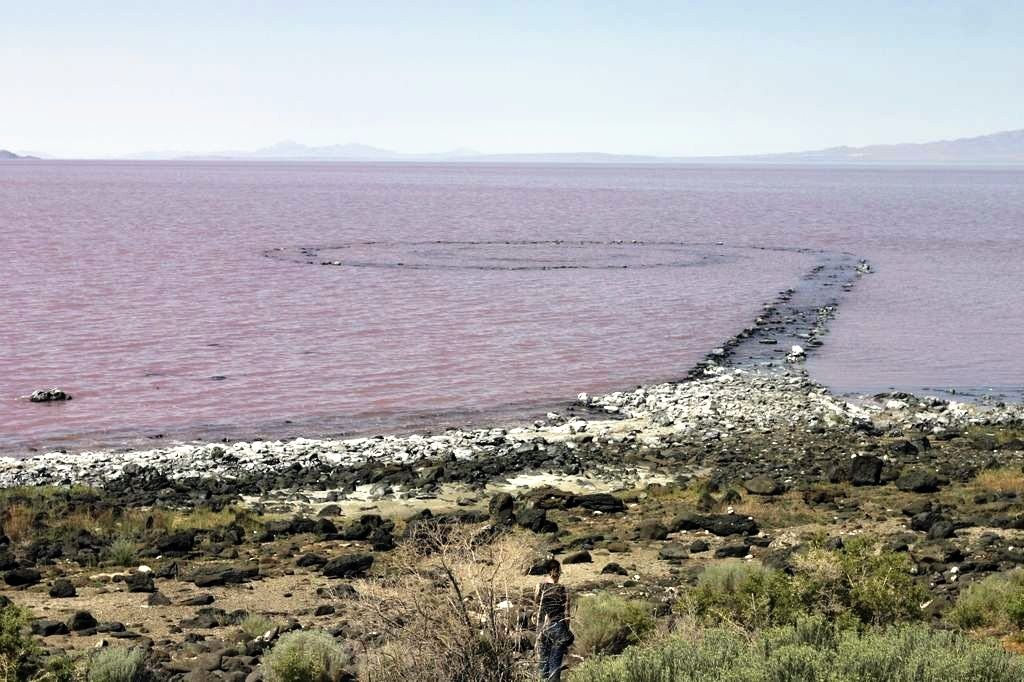 The website for the artwork explains how it was built: “Using black basalt rocks and earth from the site, the artist created a coil 1,500 feet long and 15 feet wide that stretches out counterclockwise into the translucent red water.” While the rocks were originally black, due to the salt, they are now primarily white.