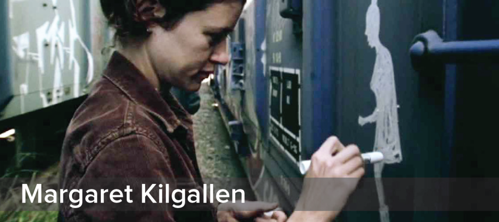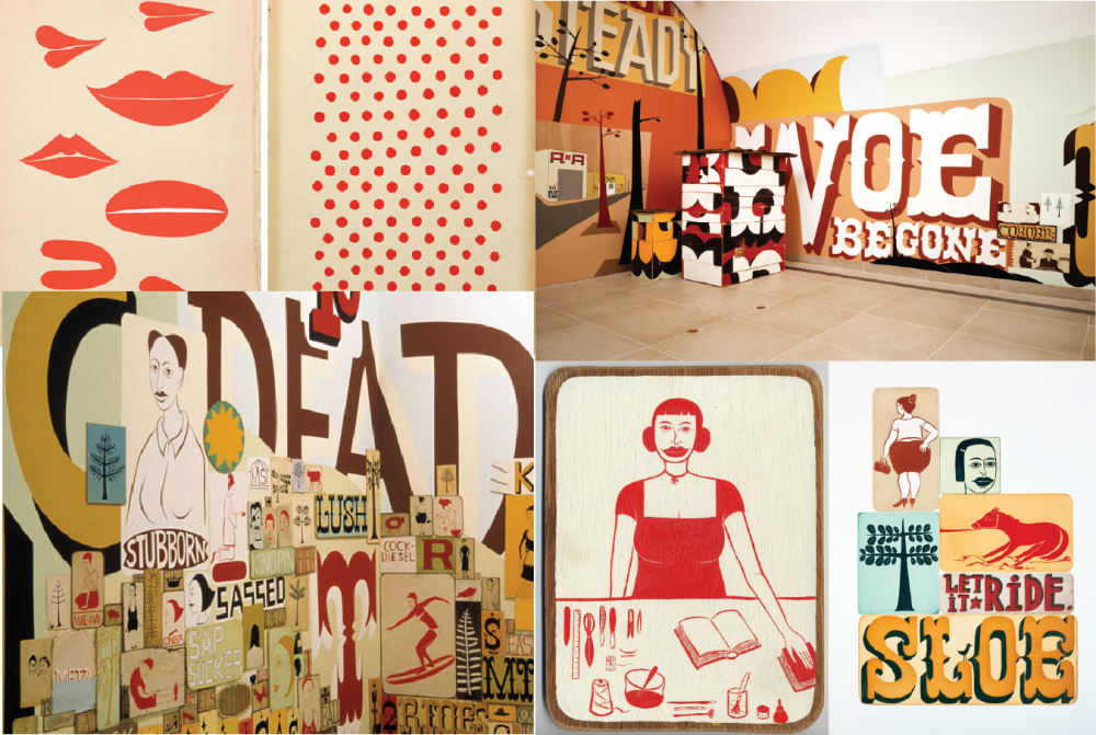 Margaret Kilgallen was known for her intricate graffiti installations that were strongly influenced by American folk art. Her use of composition expresses freedom and the delicate imperfections of dying arts like handpainted signage. All of her works are sculptural — each element holding its own as a statement. But assembled together in a group (like many of her pieces were intended) the individual elements create a visceral and powerful impact on the viewer.