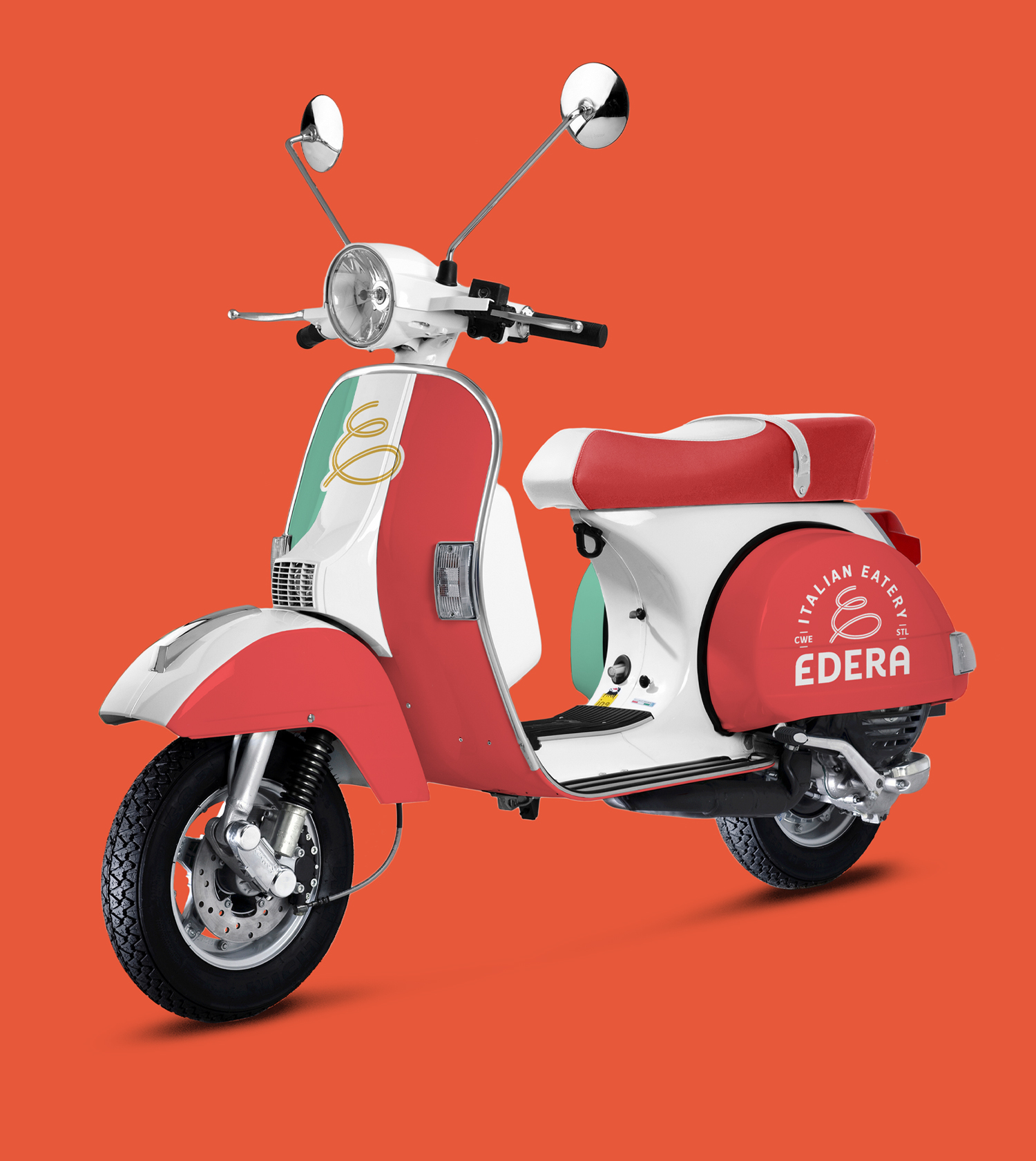 The playful personality of the Edera brand comes through at every touchpoint — from signage and matchbooks to take-out bags, T-shirts, and scooters.