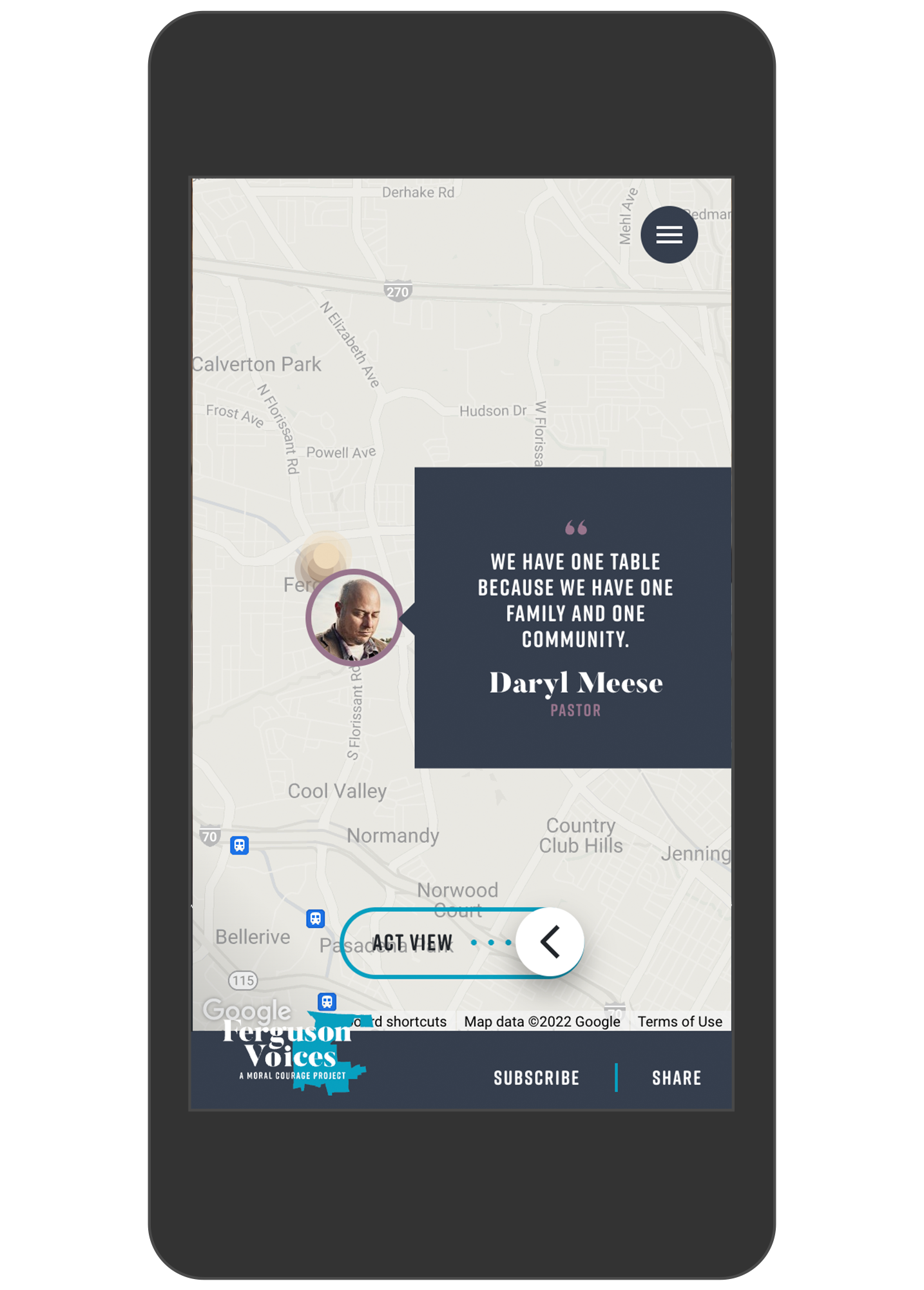 In addition to the chapter-based navigation, visitors can explore stories geographically. Interviews are plotted on a map of Ferguson, providing context for the size of the community as well as the specific place each narrative plays out in relation to where Michael Brown was killed in 2014.
