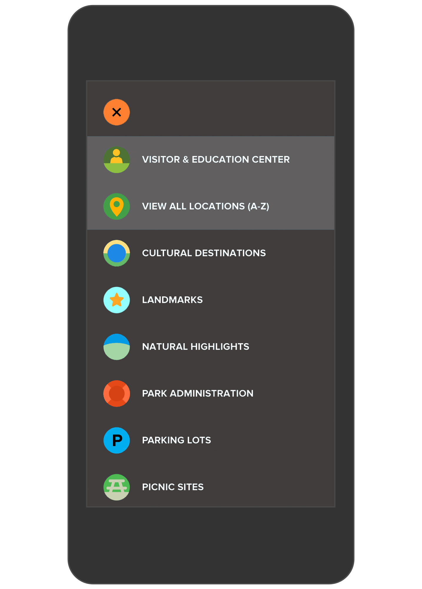 Park visitors can easily find areas of the park that suit their interests by selecting specific location categories. Tapping the “Natural Highlights” category, for example, presents the user with pinpoints for the park’s forests, islands, and savannas.