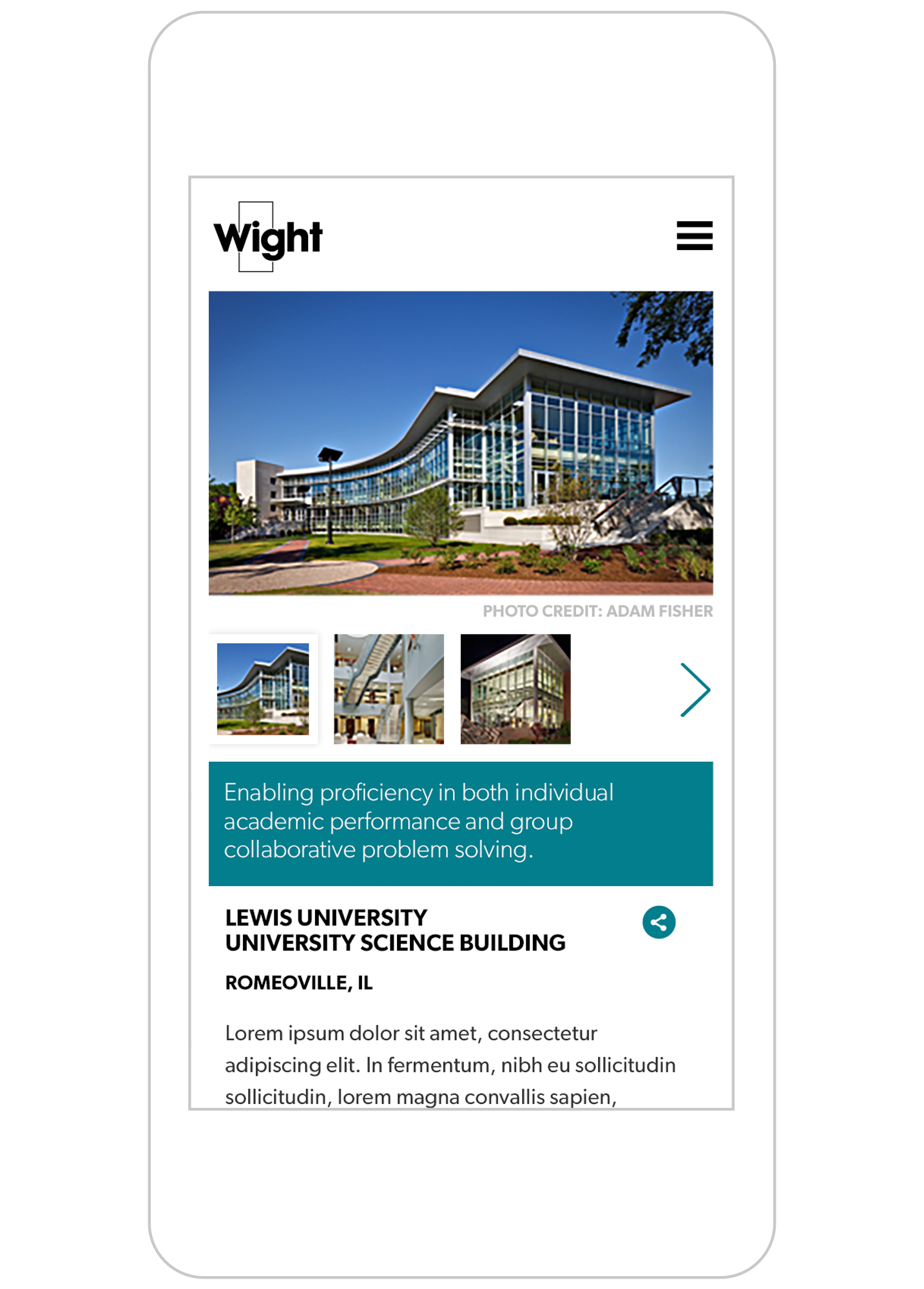 Given its diverse range of design, construction, engineering, and all-of-the-above projects, Wight needed an online portfolio flexible enough to fit this wide range of content. The highly adaptable content management system includes two separate Project page templates: one for spaces with big, beautiful photographs, and another for projects lacking in imagery.